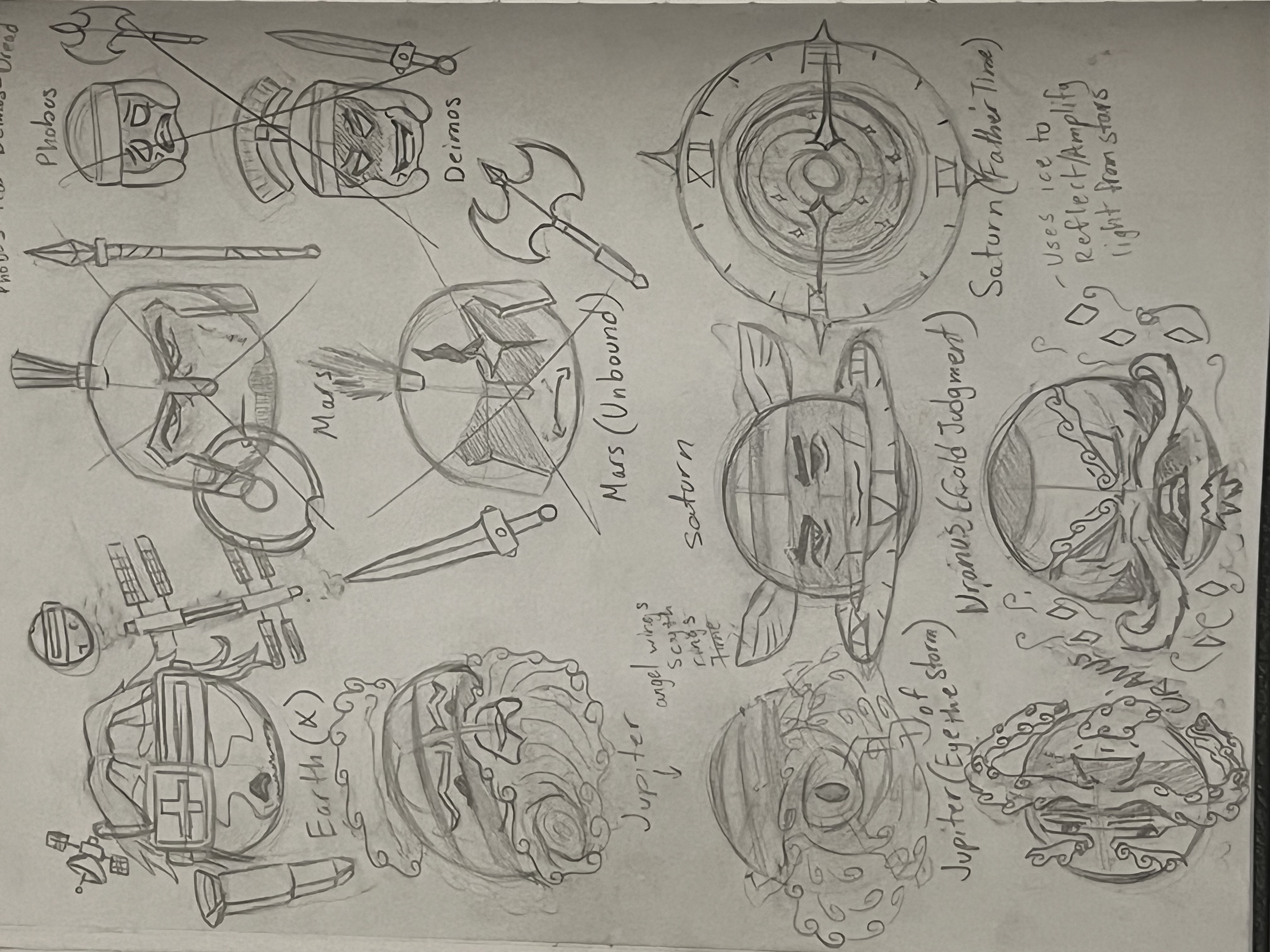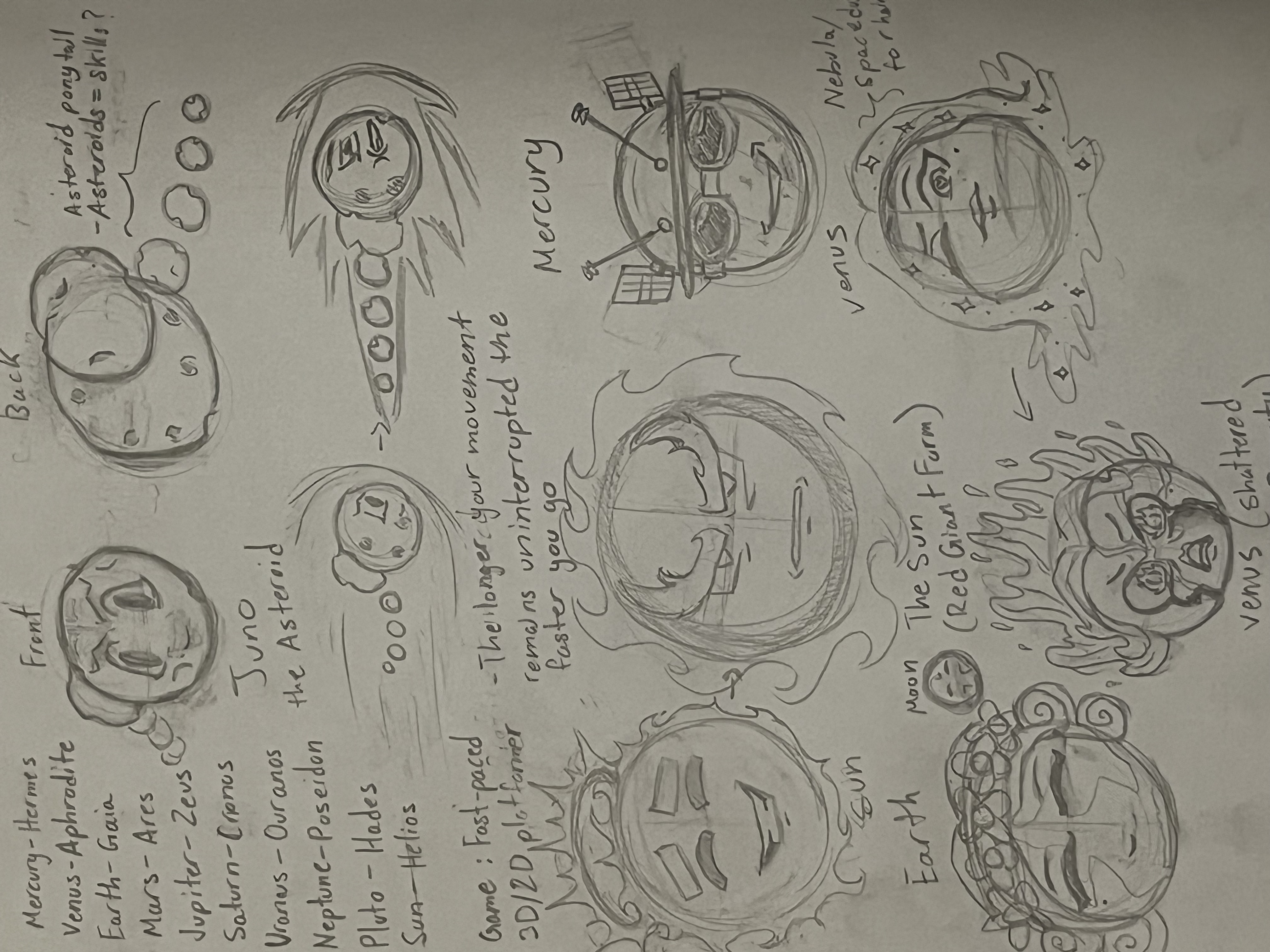 These are the designs I've sketched for the bosses in my game. They're based off the planets in our solar system, but I decided to add in aspects of the Roman/Greek gods they're named after.